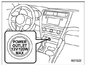 Accessory power outlets are provided below the climate control, in the center console and in the cargo area. Electrical power (12V DC) from the battery is available at any of the outlets when the ignition switch is in either the "ACC" or "ON" position. You can use an in-vehicle electrical appliance by connecting it to an outlet. The maximum power rating of an appliance that can be connected is 120W. Do not use an appliance which exceeds the indicated wattage for each outlet. When using appliances connected to two or more outlets simultaneously, the total power consumed by them must not exceed 120W.