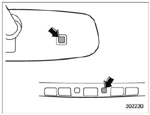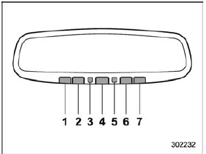 1) HomeLink button 1 The auto-dimming mirror has an anti-glare feature which automatically reduces glare coming from headlights of vehicles behind you. It also contains a HomeLink wireless control system. By pressing the automatic dimming on/off button, the automatic dimming function is turned on or off. When the automatic dimming function is on, the LED indicator will illuminate. Even with the mirror in the automatic dimming mode, the mirror surface turns bright if the shift lever/select lever is shifted into the "R" (reverse) position. This is to ensure good rearward visibility during reversing. When cleaning the mirror, use a paper towel or similar material dampened with glass cleaner. Do not spray glass cleaner directly on the mirror as that may cause the liquid cleaner to enter the mirror housing and damage the mirror. Photosensors