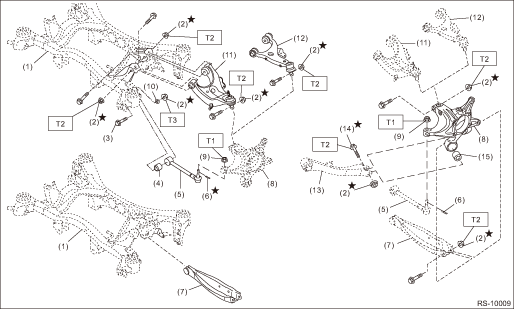 (1) | Rear sub frame ASSY | (8) | Housing ASSY - rear axle | (15) | Bushing - rear trailing link | (2) | Self-locking nut | (9) | Flange nut | | | (3) | Adjusting bolt | (10) | Adjusting washer | Tightening torque: N·m (kgf-m, ft-lb) | (4) | Bushing B - lateral link | (11) | Rear upper arm ASSY (sedan model) | T1: | 60 (6.1, 44.3) | (5) | Lateral link ASSY - front | (12) | Rear upper arm ASSY (OUTBACK model) | T2: | 80 (8.2, 59.0) | (6) | Snap pin | (13) | Trailing link | T3: | 120 (12.2, 88.5) | (7) | Lateral link ASSY - rear | (14) | Flange bolt | | |