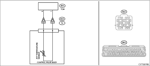 | STEP | CHECK | YES | NO | 1.CHECK HARNESS. 1) Turn the ignition switch to ON. 2) Measure the voltage between TCM connectors. Connector & terminal (B54) No. 6 (+) — (B54) No. 1 (−): | Is the voltage 5 V or more- | Repair the short circuit of harness. | Diagnostic Procedure with Diagnostic Trouble Code (DTC) > DTC P0713 TRANSMISSION FLUID TEMPERATURE SENSOR "A" CIRCUIT HIGH | 2.CHECK HARNESS. 1) Turn the ignition switch to OFF. 2) Disconnect the TCM and transmission connectors. 3) Measure the resistance between TCM connector and transmission connectors. Connector & terminal (B54) No. 6 — (B22) No. 16: (B54) No. 1 — (B22) No. 19: | Is the resistance less than 1 -- | Diagnostic Procedure with Diagnostic Trouble Code (DTC) > DTC P0713 TRANSMISSION FLUID TEMPERATURE SENSOR "A" CIRCUIT HIGH | Repair the open circuit of body harness. | 3.CHECK ATF TEMPERATURE SENSOR. Measure the resistance between transmission connector terminals. | Is the resistance 1 M- or more- | Repair the open circuit of transmission harness. | Diagnostic Procedure with Diagnostic Trouble Code (DTC) > DTC P0713 TRANSMISSION FLUID TEMPERATURE SENSOR "A" CIRCUIT HIGH | 4.CHECK ATF TEMPERATURE SENSOR. 1) Connect the connectors to TCM and transmission. 3) Warm up until the ATF temperature exceeds 50°C (122°F). 4) Turn the ignition switch to OFF. 5) Disconnect the transmission connector. 6) Measure the resistance between transmission connector terminals. | Is the resistance 730 — 1120 -- | Diagnostic Procedure with Diagnostic Trouble Code (DTC) > DTC P0713 TRANSMISSION FLUID TEMPERATURE SENSOR "A" CIRCUIT HIGH | Diagnostic Procedure with Diagnostic Trouble Code (DTC) > DTC P0713 TRANSMISSION FLUID TEMPERATURE SENSOR "A" CIRCUIT HIGH | 5.CHECK ATF TEMPERATURE SENSOR. Measure the resistance between transmission connector terminals. | Does the resistance value increase gradually while the ATF temperature decreases- | Diagnostic Procedure with Diagnostic Trouble Code (DTC) > DTC P0713 TRANSMISSION FLUID TEMPERATURE SENSOR "A" CIRCUIT HIGH | Replace the control valve body. Control Valve Body | 6.CHECK INPUT SIGNAL FOR TCM. 1) Connect the connector to transmission. 2) Turn the ignition switch to ON. (Do not start engine.) 3) Read the data of «ATF Temp.» using the Subaru Select Monitor. | Does the ATF temperature gradually decrease- | Check for poor contact of the ATF temperature sensor and transmission connector harness, and repair the defective part. | Diagnostic Procedure with Diagnostic Trouble Code (DTC) > DTC P0713 TRANSMISSION FLUID TEMPERATURE SENSOR "A" CIRCUIT HIGH | 7.CHECK FOR POOR CONTACT. | Is there poor contact of ATF temperature sensor circuit- | | Replace the TCM. Transmission Control Module (TCM) |