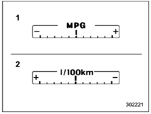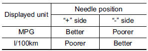 The ECO gauge shows the difference between the average rate of fuel consumption since the trip meter was last reset and the current rate of fuel consumption. The ECO gauge indicates the current fuel efficiency as shown in the following chart.