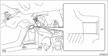 4. When there is no CVTF leakage from the transmission, add the specified fluid up to the filler plug hole lower section. Specified fluid: General Description > SPECIFICATION CAUTION: Note that when CVTF is added up to the lower section of filler plug while the transmission is in cold condition, overfilling of CVTF occurs, causing the oil to spill out.
