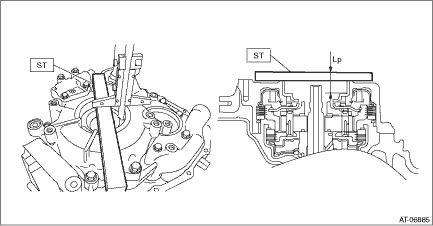 2. PROCEDURE WHEN REPLACING ONLY DRIVE PINION RETAINER OR REVERSE BRAKE HOUSING 1. Clean the mating surface of current drive pinion retainer and converter case. 2. Measure and record the shim thickness that is attached on the current reverse brake housing. 3. Using the current drive pinion retainer, measure depth “Lp1” from the ST upper face to the primary pulley bearing catch surface at several points and calculate the average.