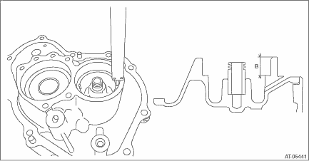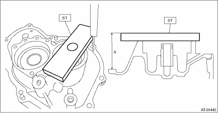 1. If the ball bearing is attached, remove the bearing and shims. Converter Case Cover > REMOVAL 2. Using the ST, measure height “A” from the ST upper face to the mating surface of the case.