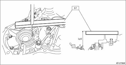 5. Calculate the “LD1” using the following formula and record it. Calculation formula: LD1 mm (in) = Lp1 − Ls1 LD1: Height from the primary pulley bearing catch surface to the secondary pulley bearing catch surface Lp1: Depth from the ST upper face to the primary pulley bearing catch surface Ls1: Depth from the ST upper face to the secondary pulley bearing catch surface 6. Using the new drive pinion retainer or new converter case, measure depth “Lp2” from the ST upper face to the primary pulley bearing catch surface at several points and calculate the average.