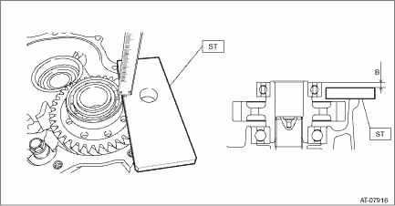 3. Obtain the thickness of shim using the following formula to select none to two shims. T mm = (A − 15) − (B + 15) − (0.05 — 0.25) [T in = (A − 0.591) − (B + 0.591) − (0.002 — 0.01)] T: Shim thickness A: Depth from the ST upper face to the ball bearing catch surface B: Height from the ST to the end of the ball bearing outer ring 15 mm (0.591 in): Thickness of ST 0.05 — 0.25 mm (0.002 — 0.01 in): Clearance