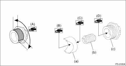 6. Apply a coat of grease to the sliding surface (B) of the pad - pressure (a) and seating surface (C) of spring - gearbox (b), and then insert the pad - pressure (a) into steering body. 7. Charge the adjusting screw (c) with grease (D), and then insert the spring - gearbox (b) into adjusting screw. Then install on the steering body. Grease: Molywhite LS-G 8. Apply liquid gasket to 1/3 or more (A) of entire perimeter of adjusting screw thread (c). Liquid gasket: SEAL END No. 22