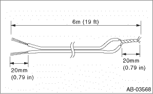 8. Prepare a six-meter (19 ft) long vinyl-shielded parallel wire. Peel off the shield of both ends approx. 20 mm (0.79 in) and twist one end together into shorted condition. 9. The other end, not shorted, will be connected to harnesses of repaired body connector as shown in the figure, and insulated with vinyl tape.