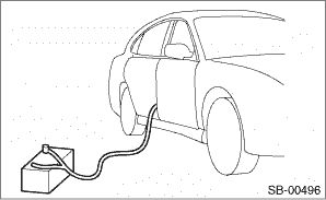 10. Move the battery at least 5 m (16 ft) from the vehicle, and confirm safety in the area. 11. Connect the airbag deployment tool alligator clip to the battery negative (−) terminal. 12. Connect the other cable of airbag deployment tool to the battery positive (+) terminal, and activate the airbag module. CAUTION: • After activation, the airbag module will be extremely hot. Let it cool down for at least 40 minutes in an area with no one around. • Do not expose the activated airbag module to water.