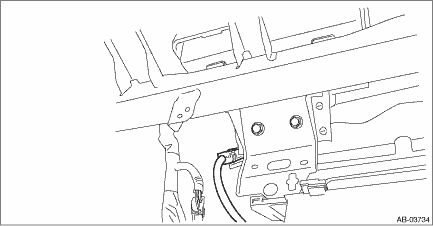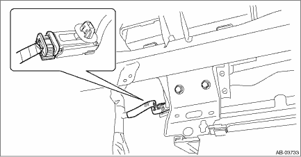 3. SEAT CUSHION AIRBAG MODULE 1. Turn the ignition switch to OFF. 2. Disconnect the ground terminal from the battery sensor, and wait for at least 60 seconds before starting work. NOTE 3. Disconnect the seat cushion airbag module connector under the front seat cushion. Airbag Connector > PROCEDURE 4. Adjust both the front seat and front seat backrest to the center positions. 5. Short the terminal to the alligator clip furnished as airbag deployment tool. CAUTION: The airbag deployment tool should be kept shorted on the terminals until just before activation of airbag module. Preparation tool: ST: AIRBAG DEPLOYMENT TOOL (98299PA030) 6. Connect airbag deployment tool (A) and test harness adapter AU (B). Preparation tool: ST: TEST HARNESS ADAPTER AU (98299AL000)