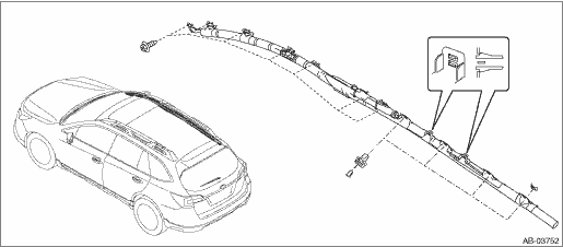 5. CURTAIN AIRBAG MODULE 1. Turn the ignition switch to OFF. 2. Disconnect the ground terminal from the battery sensor, and wait for at least 60 seconds before starting work. NOTE 3. Remove the roof trim. • Sedan model: Roof Trim > REMOVAL • OUTBACK model: Roof Trim > REMOVAL 4. Disconnect the curtain airbag harness. Airbag Connector > PROCEDURE