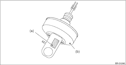 1. Install the seal to the cylinder body assembly. 2. Install the reservoir tank. CAUTION: Be careful not to tighten a vise excessively. (1) Place the master cylinder assembly between aluminum plates and fix it on a vise. (2) Drive the pin using a punch and a hammer to install the reservoir tank. |
