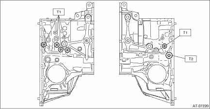 1. Install the oil drain plug. Tightening torque: 70 N·m (7.1 kgf-m, 51.6 ft-lb) 2. Install the overflow drain plug. NOTE: Overflow plug of differential gear oil is temporarily attached. 3. Install all plugs. NOTE: Use new O-rings. Tightening torque: T1: 22 N·m (2.2 kgf-m, 16.2 ft-lb) T2: 22.5 N·m (2.3 kgf-m, 16.6 ft-lb)