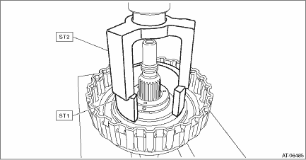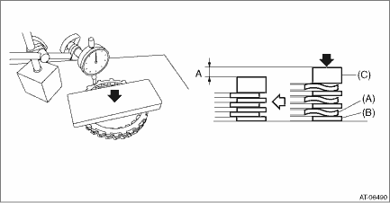 10. Using the following formula, read the push/pull gauge and calculate “N”. N = 52 N (5.3 kgf, 11.7 lb) − Z 52 N (5.3 kgf, 11.7 lb) : Load applied to clutch plate Z: Flat board weight 11. Press the center of retaining plate by applying a force of “N” using push/pull gauge, and then measure and record the compression amount “A”. NOTE: Measure at four points with a 90° interval and calculate the average.