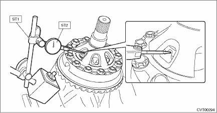 (2) Using ST1 and ST2, insert the ST2 through the window of differential case. Measure the backlash of the gear. NOTE: • Measure the backlash by applying a differential bevel pinion tooth between two differential bevel gear teeth. • When measuring, fix the differential bevel pinion in place with a screwdriver covered with cloth, or a similar tool.