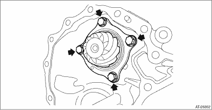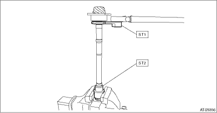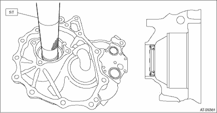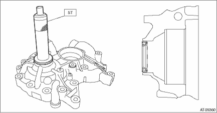 1. Install the O-ring to plug and install the plug to drive pinion retainer. NOTE: • Use new O-rings. • Apply CVTF to the O-rings. Tightening torque: 25 N·m (2.5 kgf-m, 18.4 ft-lb) 2. Using the ST, install the oil seal to drive pinion retainer. NOTE: • Apply CVTF to the oil seal press-fitting surface and lip. • Install the oil seal in the correct direction. Pulley side