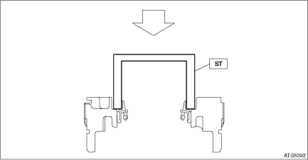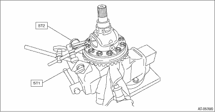 (2) Measure the gear backlash using ST1 and ST2, and then insert the ST2 through the window of differential case.