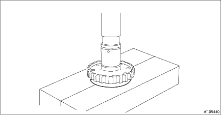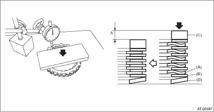 5. Using the following formula, calculate load “N”, a force of pressing with push/pull gauge. N = 130N (13.3 kgf, 29.2 lb) – Z 130 N (13.3 kgf, 29.2 lb) : Load applied to clutch plate Z: Flat board weight 6. Press the center of retaining plate by applying a force of “N” using push/pull gauge, and then measure and record the compression amount “A”. NOTE: Measure at four points with a 90° interval and calculate the average.