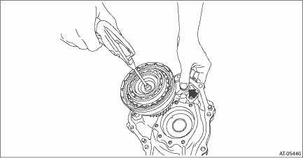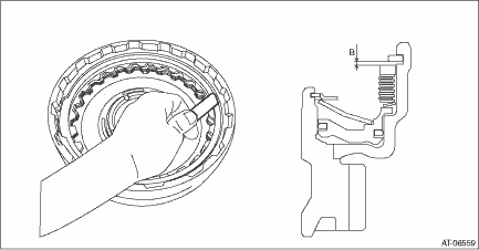 7. Install the dish plate, driven plate, drive plate, retaining plate and snap ring. NOTE: Make sure of the direction of dish plate. 8. Measure and record the clearance “B” between the retaining plate and snap ring. NOTE: Before measuring, press down the whole circumference of retaining plate using your finger.