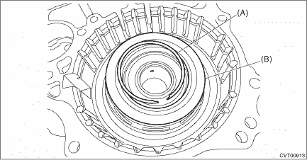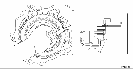 13. Install the dish plate, drive plate, driven plate, retaining plate and snap ring to intermediate case. NOTE: Install the dish plate in the correct direction. 14. Measure and record the clearance “B” between the retaining plate and snap ring.