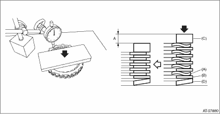 11. Using the following formula, read the push/pull gauge and calculate “N”. N = 84 N (8.6 kgf, 18.9 lb) – Z 84 N (8.6 kgf, 18.9 lb) : Load applied to clutch plate Z: Flat board weight 12. Press the center of retaining plate by applying a force of “N” or more using push/pull gauge, and then measure and record the compression amount “A”. NOTE: Measure at four points with a 90° interval and calculate the average.