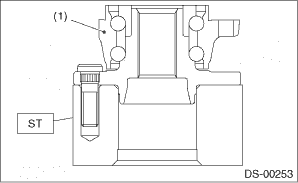 1. Install the hub unit COMPL to the ST securely. Preparation tool: ST: HUB STAND (28099PA080) 2. Using a press, press new bolts - hub until their seating surfaces contact the hub unit COMPL. NOTE: Use the 12 mm (0.47 in) dia. holes in the HUB STAND to prevent bolts from tilting.