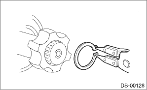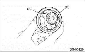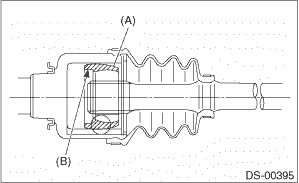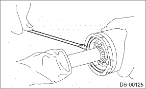 10. Install the snap ring in the groove on the DOJ outer race. NOTE: • Assure that the balls, cage and inner race are completely fitted in the outer race of DOJ. • Use care not to place the matched position of snap ring in the ball groove of outer race. • Pull the shaft lightly and assure that the circlip is completely fitted in the groove.