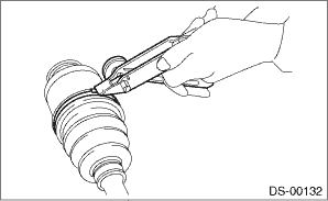 11. Apply an even coat of the specified grease [20 to 30 g (0.71 to 1.06 oz)] to the entire inner surface of boot. Also apply grease to the shaft. 12. Install the DOJ boot taking care not to twist it. NOTE: • The inside of the large end of DOJ boot and the boot groove shall be cleaned so as to be free from grease and other substances. • When installing the DOJ boot, position the outer race of DOJ at center of the stroke. 13. Put a new band through the clip and wind twice in the band groove of the boot. 14. Pinch the end of band with pliers. Hold the clip and tighten securely. NOTE: When tightening boot, use care so that the air within the boot is appropriate. 15. Tighten the band using the ST. NOTE: Tighten the band until it cannot be moved by hand. Preparation tool: ST: BAND TIGHTENING TOOL (925091000)