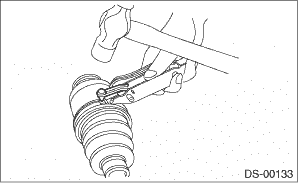 17. Cut off the band with an allowance of about 10 mm (0.39 in) left from the clip and bend this allowance over the clip. NOTE: Be careful so that the end of the band is in close contact with clip. 18. Install the BJ boot or EBJ boot band in the same procedure as a DOJ boot. 19. Extend and retract the DOJ repeatedly to provide an equal coating of grease. |
