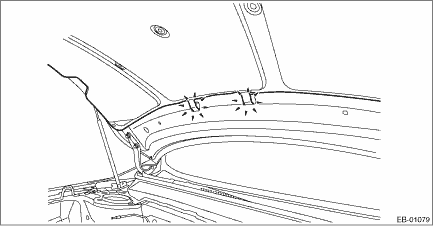 1. Install the hinge COMPL - front hood. Tightening torque: 25 N·m (2.5 kgf-m, 18.4 ft-lb) 2. Install the stay assembly - front hood. Tightening torque: 20 N·m (2.0 kgf-m, 14.8 ft-lb) 3. Install the insulator - front hood. NOTE: Securely insert the claws of the insulator - front hood.