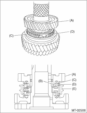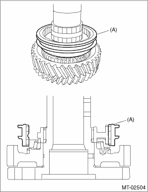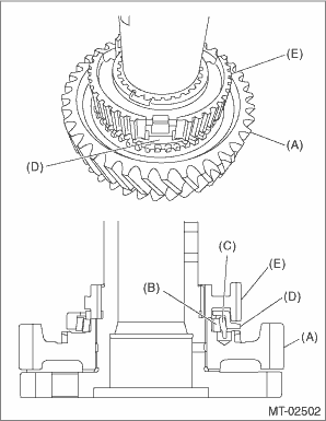 1. Install the 1st driven gear, 1st inner baulk ring, 1st synchro cone, 1st outer baulk ring and 1st-2nd synchronizer hub. NOTE: • Install the 1st-2nd synchronizer hub in proper direction. • Align the protrusion of the 1st outer baulk ring into the groove of the 1st-2nd synchronizer hub.