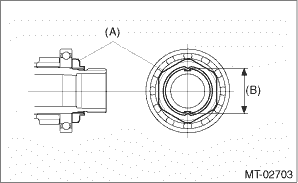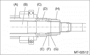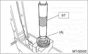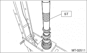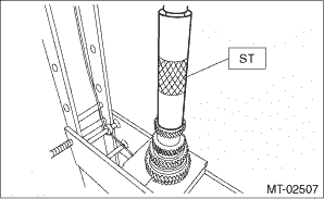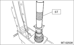 10. Install the drive pinion spacer to the driven shaft. 11. Install the 6th driven gear using ST and press. CAUTION: Do not apply a load in excess of 10 kN (1 ton, 1.1 US ton, 1.0 Imp ton). NOTE: Install with the stepped side on the end surface of the 6th driven gear facing the rear ball bearing side.