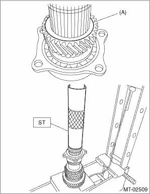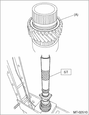 9. Install the 5th driven gear using ST and press. CAUTION: Do not apply a load in excess of 10 kN (1 ton, 1.1 US ton, 1.0 Imp ton). NOTE: Install the 5th driven gear with the groove side facing the 6th driven gear.