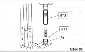 2. Install the 2nd driven gear bushing using ST and a press. CAUTION: Do not apply a load in excess of 10 kN (1 ton, 1.1 US ton, 1.0 Imp ton). NOTE: • Attach a cloth to the end of the driven shaft to prevent damage. • When press fitting, align the oil holes of the driven shaft and 2nd driven gear bushing.