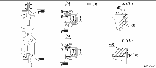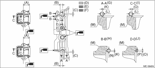 2. Set the intake camshaft LH and the exhaust camshaft LH to the cam carrier LH. NOTE: Apply engine oil to the journals of cam carrier LH before setting the intake camshaft LH and exhaust camshaft LH. 3. Install the front camshaft cap LH, intake center camshaft cap LH, intake rear camshaft cap LH, exhaust center camshaft cap LH and exhaust rear camshaft cap LH. (1) Apply liquid gasket to the mating surface of front camshaft cap LH, intake rear camshaft cap LH and exhaust rear camshaft cap LH as shown in the figure. CAUTION: • Do not apply liquid gasket excessively. Applying excessively may cause excess gasket to flow toward camshaft journal, resulting in engine seizure. • Do not apply liquid gasket excessively to the intake center camshaft cap LH and exhaust center camshaft cap LH. NOTE: • Before applying liquid gasket, degrease the old liquid gasket seal surface of the front camshaft cap LH, intake rear camshaft cap LH, exhaust rear camshaft cap LH, and cam carrier LH. • Install within 5 min. after applying liquid gasket. Liquid gasket: THREE BOND 1217G (Part No. K0877Y0100), THREE BOND 1217H or equivalent Liquid gasket applying diameter: Mating surfaces other than ranges A, B and C 2±0.5 mm (0.0787±0.0197 in) Mating surfaces of ranges A and C 3.5±0.5 mm (0.1378±0.0197 in) Mating surfaces of range B 3+0.5 −0 mm (0.1181+0.0197 −0 in)