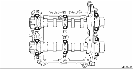 (2) Apply engine oil to the journals of each camshaft cap before setting the camshaft cap. (3) Tighten the bolts which secure front camshaft cap LH, intake center camshaft cap LH, intake rear camshaft cap LH, exhaust center camshaft cap LH and exhaust rear camshaft cap LH in numerical order as shown in the figure. Tightening torque: 18 N·m (1.8 kgf-m, 13.3 ft-lb)