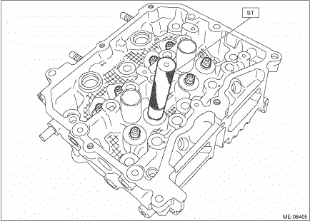 1. Using the ST, install the valve oil seals to valve guides of cylinder head RH. CAUTION: • During work, place a waste cloth, etc. to avoid scratching the mating surface of the cylinder head RH. • Use special care not to damage the cylinder head RH and guide during work. • When installing the valve oil seal, press the ST with hands to install it and never drive the ST with a plastic hammer, otherwise the valve oil seal can be damaged. NOTE: • Use a new valve oil seal. • Apply engine oil to valve oil seal before installing. • The intake valve oil seals and exhaust valve oil seals are distinguished by their colors. Identification colors: Intake [Gray] Exhaust [Green] • For installation of valve guide, refer to INSPECTION. Cylinder Head > INSPECTION