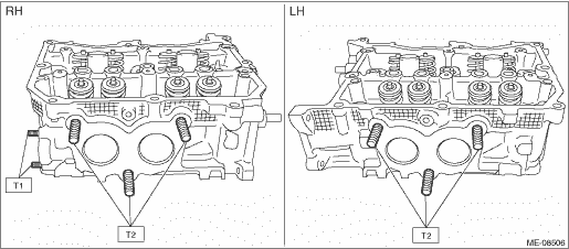 4. Install the valve spring seat, valve spring, valve spring retainer, valve and valve collet to the cylinder head LH. 5. Lightly tap the valve spring retainer with a plastic hammer, and make sure that the valve collet is securely attached. 6. Install the stud bolts onto cylinder heads. Tightening torque: T1: 6.4 N·m (0.7 kgf-m, 4.7 ft-lb) T2: 18 N·m (1.8 kgf-m, 13.3 ft-lb)