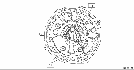 3. Install the IC regulator, and secure it to the rear cover using the four screws. Tightening torque: T1: 2 N·m (0.2 kgf-m, 1.5 ft-lb) T2: 3.9 N·m (0.4 kgf-m, 2.9 ft-lb)