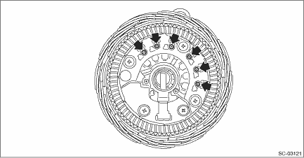 4. Install the stator coil, and secure it together with the rectifier using six bolts. Tightening torque: 2 N·m (0.2 kgf-m, 1.5 ft-lb)