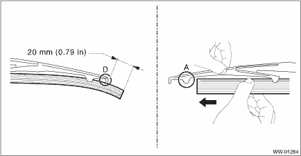 2. Insert the rubber assembly - rear wiper until its top end protrudes approx. 20 mm (0.79 in) from stopper (D). 3. Insert the rubber assembly - rear wiper into claw (A).
