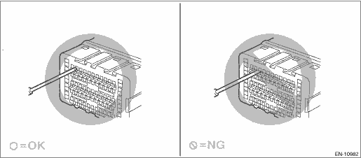 1. Airbag system wiring harness is routed near the ECM, main relay and fuel pump relay. CAUTION: • Do not use electrical test equipment on the airbag system circuits. • Be careful not to damage the airbag system wiring harness when servicing the ECM, TCM, main relay and fuel pump relay. 2. Never connect the battery in reverse polarity. Doing so will damage the ECM instantly, and other parts will also be damaged. 3. Do not disconnect the battery terminals while the engine is running. A large counter electromotive force will be generated in the generator, and this voltage may damage electronic parts such as ECM etc. 4. After connecting the battery terminals, wait for at least 10 seconds before tuning the ignition switch to ON. NOTE 5. When disconnecting the connectors of the electrical components, always be sure to turn the ignition switch to OFF. Perform the Clear Memory Mode after connecting the connectors. Clear Memory Mode 6. When measuring the voltage or resistance of individual sensor or all electrical control modules, use a tapered pin with a diameter of 0.6 mm (0.024 in) or less and touch it to the tip of terminal.
