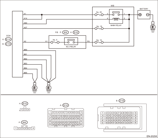 6.CHECK INPUT VOLTAGE OF ECM. 1) Turn the ignition switch to OFF. 2) Connect the connector to ECM. 3) Turn the ignition switch to ON. 4) Measure the voltage between ECM connector and chassis ground. Connector & terminal (B134) No. 1 (+) — Chassis ground (−): (B134) No. 14 (+) — Chassis ground (−): | Is the voltage 10 V or more- | Check ignition control system. Diagnostics for Engine Starting Failure > IGNITION CONTROL SYSTEM | Repair the harness and connector. NOTE: In this case, repair the following item: • Open circuit in harness between ECM connector and main relay connector • Poor contact of main relay connector • Poor contact of ECM connector |