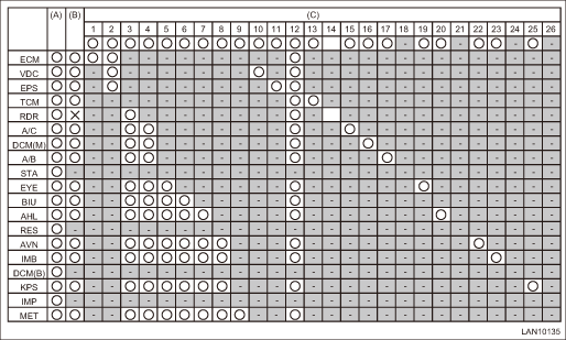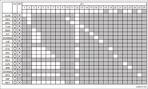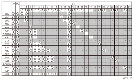 1. Module installation check (1) Write “-” marks in the field for installation check if the vehicle to be inspected does not have relevant module. (2) Write “-” marks in all blank fields on the same row that the “-” mark has filled in. NOTE: Example of writing Subaru Select Monitor > COMMUNICATION FOR INITIALIZING IMPOSSIBLE 2. Subaru Select Monitor communication initialization check (1) Write “ If the communication with all modules is not possible, go to 3). (2) Write “ (3) When at least one field in a column of wiring location is filled with the “ (4) Check the open circuit of the modules which have no “ (5) If the communication is not possible after checking all harnesses, check the module power supply line. (6) Replace the module if the power supply line is normal. NOTE: • Example of writing Subaru Select Monitor > COMMUNICATION FOR INITIALIZING IMPOSSIBLE • Inspection using the communication for initializing of Subaru Select Monitor cannot be used to diagnose the wiring location marked with “-”. Example of DTC data not received List of Diagnostic Trouble Code (DTC) > LIST should be used to identify the faulty portion. 3. Subaru Select Monitor communication initialization check (impossible to communicate with all modules) NOTE: If at least one module becomes possible to communicate, return to 2). (1) Check for the short circuit to ground. CAN Communication Circuit Check > INSPECTION If it is normal, go to the next. (2) Check for the short circuit to battery. CAN Communication Circuit Check > INSPECTION If it is normal, go to the next. (3) Perform the inspection for the resistance of 52 - or less (short between wires). CAN Communication Circuit Check > INSPECTION If it is normal, go to the next. (4) Check for the open circuit of network diagram No. 12 (data link connector). 2. EXAMPLE OF WRITING FOR THE CHECK SHEET OF COMMUNICATION FOR INITIALIZING • When No. 1 is open