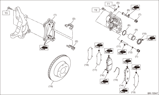 1. FRONT DISC BRAKE • 16-inch (1) | Support - front disc brake | (9) | Piston - disc brake | (17) | Shim - disc brake front inner A | (2) | Pad clip - front brake | (10) | Piston boot | (18) | Shim - disc brake front inner B | (3) | Caliper body | (11) | Lock pin - front brake | (19) | Disc rotor (ventilated type) | (4) | Bleeder - screw | (12) | Lock pin - sleeve | | | (5) | Cap - bleeder | (13) | Shim - disc brake front outer | Tightening torque: N·m (kgf-m, ft-lb) | (6) | Guide pin - front brake | (14) | Pad - disc brake front outer | T1: | 8 (0.8, 5.9) | (7) | Pin boot | (15) | Spring - brake pad | T2: | 50 (5.1, 36.9) | (8) | Piston seal | (16) | Pad - disc brake front inner | T3: | 120 (12.2, 88.5) |
