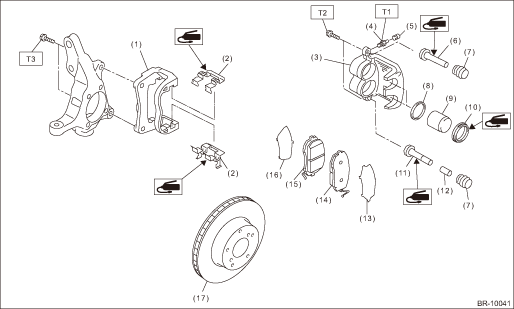 • 17-inch (1) | Support - front disc brake | (9) | Piston - disc brake | (17) | Disc rotor (ventilated type) | (2) | Pad clip - front brake | (10) | Piston boot | | | (3) | Caliper body | (11) | Lock pin - front brake | Tightening torque: N·m (kgf-m, ft-lb) | (4) | Bleeder - screw | (12) | Lock pin - sleeve | T1: | 8 (0.8, 5.9) | (5) | Cap - bleeder | (13) | Shim - disc brake front outer | T2: | 27 (2.8, 20.3) | (6) | Guide pin - front brake | (14) | Pad - disc brake front outer | T3: | 120 (12.2, 88.5) | (7) | Pin boot | (15) | Pad - disc brake front inner | | | (8) | Piston seal | (16) | Shim - disc brake front inner | | |