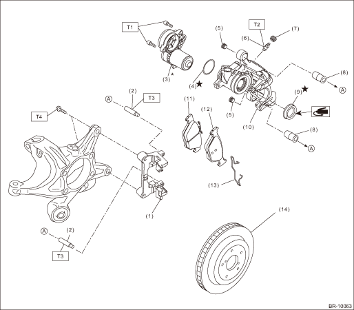 2. REAR DISC BRAKE (1) | Support - rear disc brake | (8) | Pin boot | Tightening torque: N·m (kgf-m, ft-lb) | (2) | Guide pin - rear brake | (9) | Piston boot | T1: | 8 (0.8, 5.9) | (3) | Parking brake actuator ASSY | (10) | Caliper body | T2: | 17 (1.7, 12.5) | (4) | O-ring | (11) | Pad - disc brake rear inner | T3: | 25 (2.5, 18.4) | (5) | Cap | (12) | Pad - disc brake rear outer | T4: | 66 (6.7, 48.7) | (6) | Bleeder - screw | (13) | Pad clip | | | (7) | Cap - bleeder | (14) | Disc rotor (ventilated type) | | |