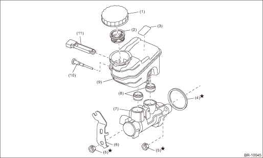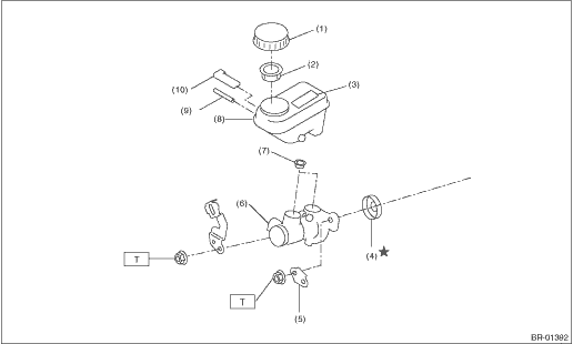 *: The component cannot be reused when the emergency release of parking brake was performed or when the actuator has a malfunction. 3. MASTER CYLINDER • H4 model (1) | Cap - reservoir tank | (6) | Cylinder body ASSY | Tightening torque: N·m (kgf-m, ft-lb) | (2) | Filter - master cylinder | (7) | Seal | T: | 13 (1.3, 9.6) | (3) | Caution label (model with caution label) | (8) | Reservoir tank | | (4) | Seal sub ASSY | (9) | Pin | | | (5) | Bracket - master cylinder | (10) | Level - indicator | | |