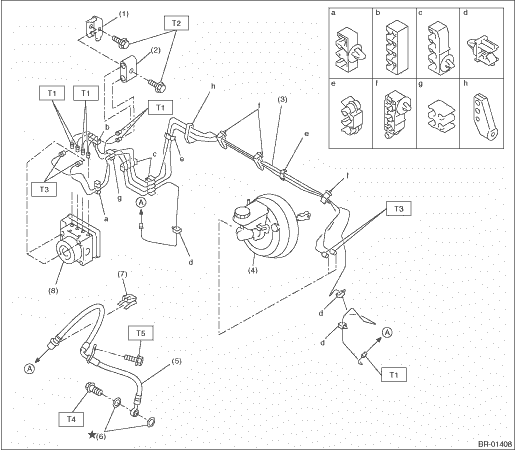 4. FRONT BRAKE PIPES AND HOSES • Models without EyeSight (1) | Bracket | (5) | Front brake hose RH/LH | Tightening torque: N·m (kgf-m, ft-lb) | (2) | Connector - two-way | (6) | Gasket | T1: | 15 (1.5, 11.1) | (3) | Front brake pipe ASSY | (7) | Clamp | T2: | 18 (1.8, 13.3) | (4) | Master cylinder ASSY | (8) | VDC control module and hydraulic control unit (VDCCM&H/U) | T3: | 19 (1.9, 14.0) | | | | | | T4: | 26 (2.7, 19.2) | | | | | | T5: | 33 (3.4, 24.3) |