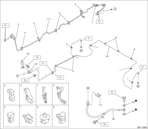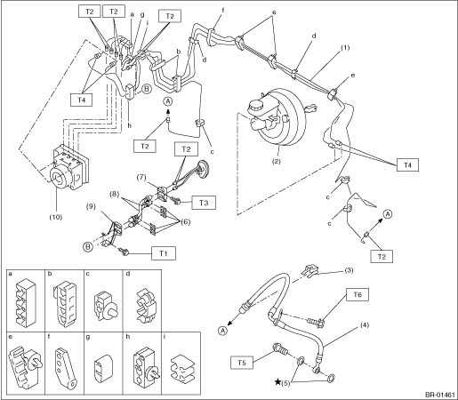 • Models with EyeSight (1) | Front brake pipe ASSY | (6) | Clamp | Tightening torque: N·m (kgf-m, ft-lb) | (2) | Master cylinder ASSY | (7) | Bracket | T1: | 7.5 (0.8, 5.5) | (3) | Clamp | (8) | Brake hose ASSY | T2: | 15 (1.5, 11.1) | (4) | Front brake hose RH/LH | (9) | Bracket | T3: | 18 (1.8, 13.3) | (5) | Gasket | (10) | VDC control module and hydraulic control unit (VDCCM&H/U) | T4: | 19 (1.9, 14.0) | | | | | | T5: | 26 (2.7, 19.2) | | | | | | T6: | 33 (3.4, 24.3) |